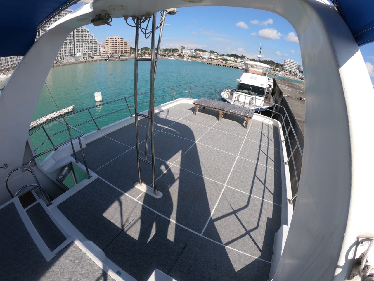 エントリースペースのデッキは座って器材が背負いやすい高さです。2本のラダー(梯子)の間が広く取られているので、一気に5名のエントリーが可能です。